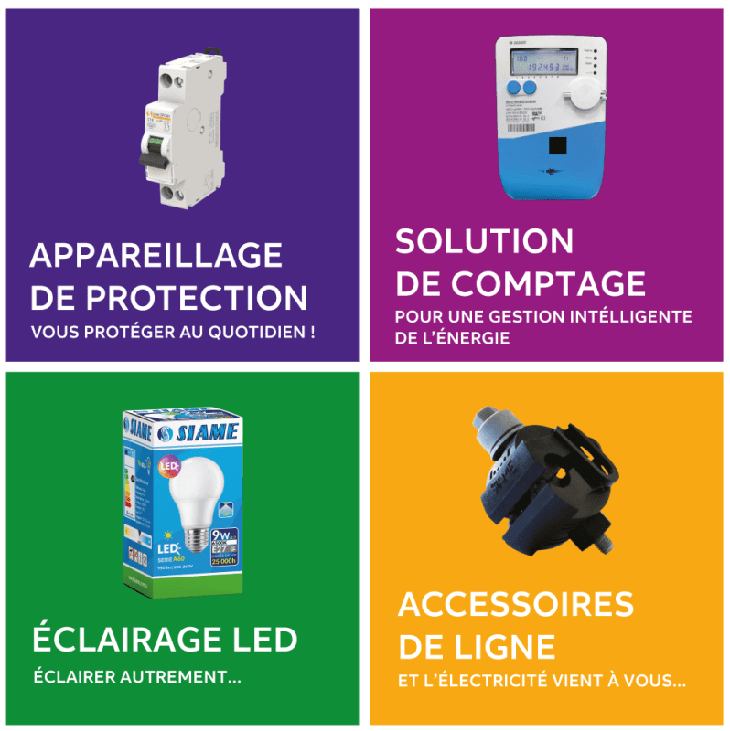 Au fil des années, la SIAME a évolué pour englober une large gamme de produits, incluant des compteurs d’énergie, des disjoncteurs modulaires, des accessoires pour lignes basse et moyenne tension et des lampes économiques LED.